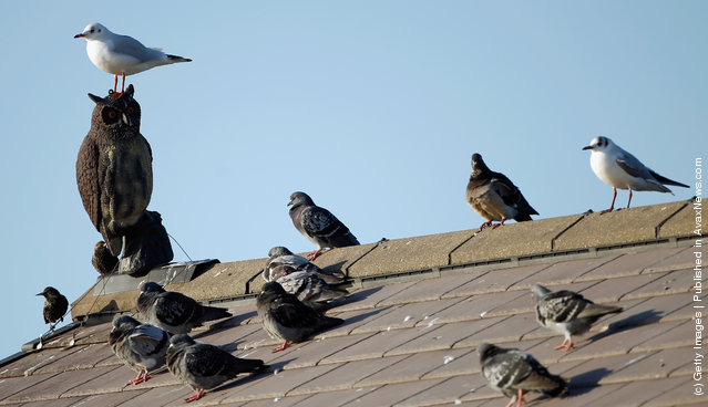 I watched the birds for quite some time before I saw the other figures, the large, threatening-looking, evil-eyed plastic owls mounted on the roof, staring blankly at the pigeons circling around them. Some pigeons even bumped up against the owls. Were the pigeons showing disdain, mocking the owls’ very existence, or did it just seem that way to me?