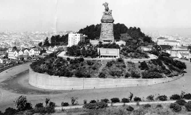 In the late 1880s, during the days when such monuments were erected, Adolph Sutro, a silver baron, philanthropist and former mayor who owned the hill at the precise geographic center of the city, decided to commission Belgian artist Atoine Wiertz to build an allegorical piece depicting the victory of liberty, depicted as a torch-carrying lady, over despotism, a cowering muscled hulk. And so it was completed, installed and dedicated on Thanksgiving Day, 1887. At the dedication ceremony, Sutro said: “May the light shine from the torch of the Goddess of Liberty to inspire our citizens to good and noble deeds for the benefit of mankind.”