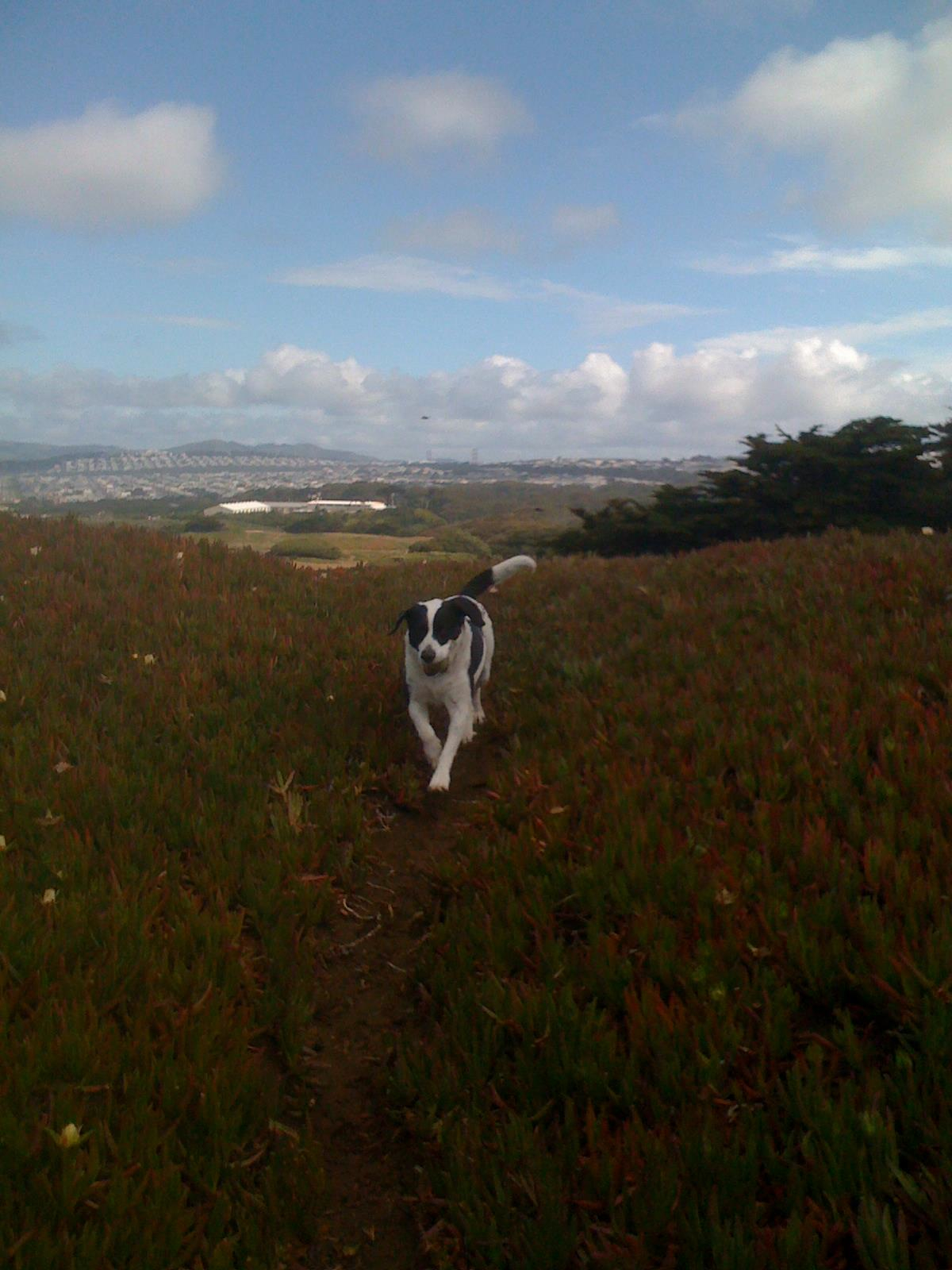 The longer we were together, of course, the more her loving and playful side came out. She loved chasing balls – could do it all day on the right day with the right partner(s). She loved walking together on the bluffs above the mighty Pacific, at Fort Funston. She loved playing in the snow. When in the right mood and with the right person, she loved being hugged and whispered to. She loved laying by the fire at our mountain cabin after a day in the great outdoors. She would lay down with each family member in turn every night as they went to bed – Giggy first, then Ella, then Erika and I, where she would generally make herself comfortable on our bed for the duration.